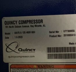 Item Type: Air Compressor Manufacturer: Quincy Model: QSI 175 Serial: UTY309855 Year: 2023 Last Use: Bottling Plant Dimensions: 7 x 5 x 6 Condition: Excellent