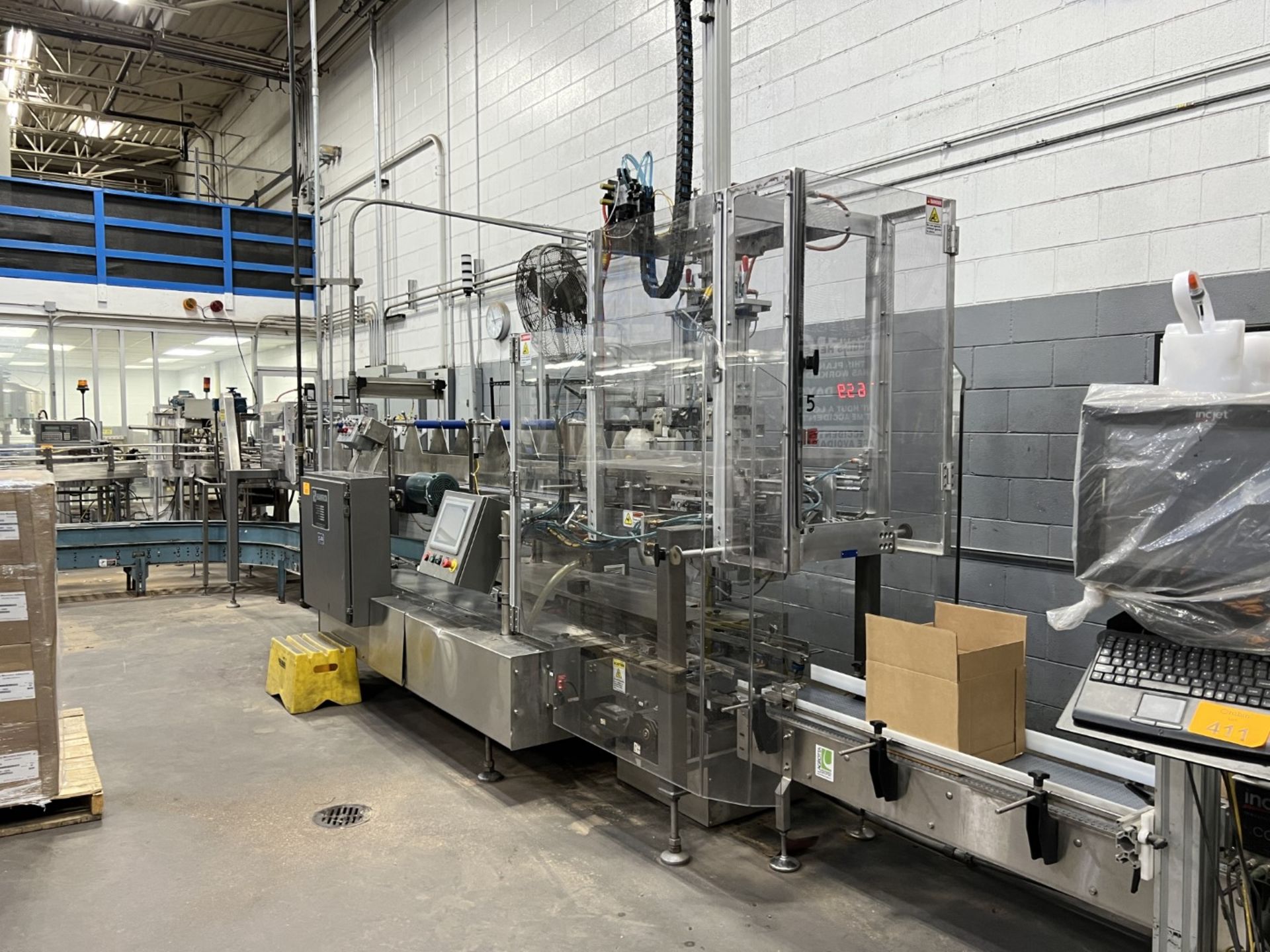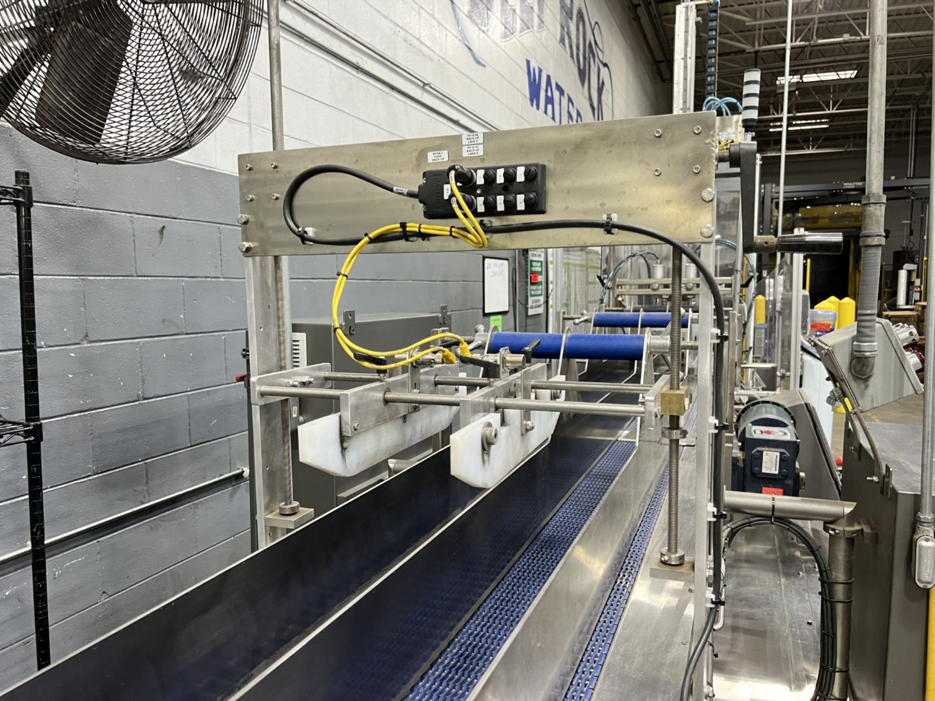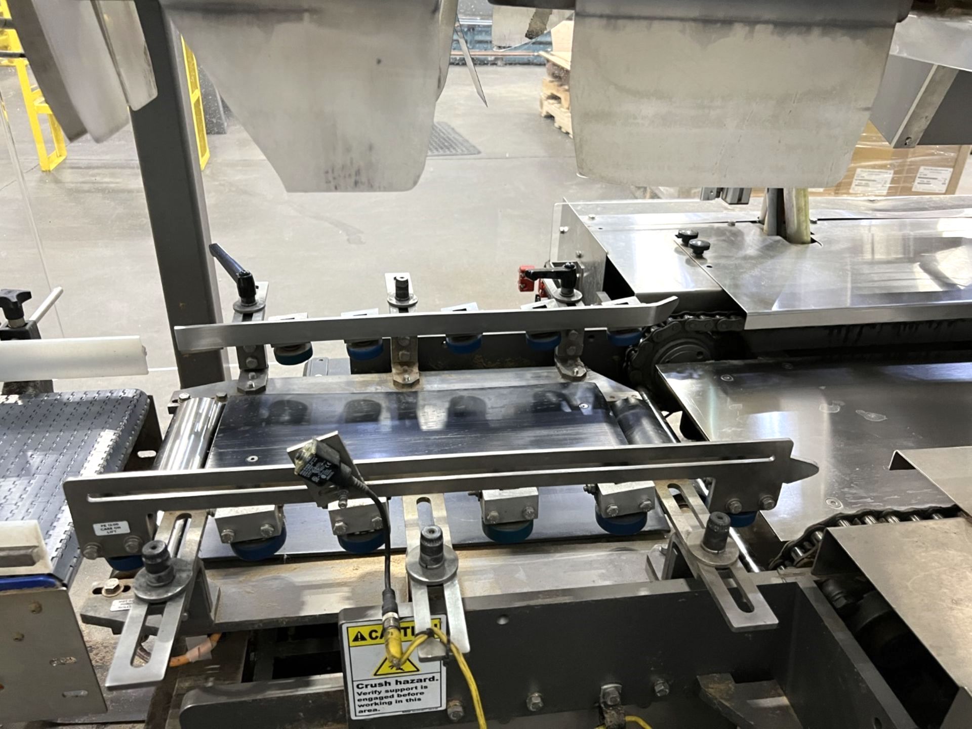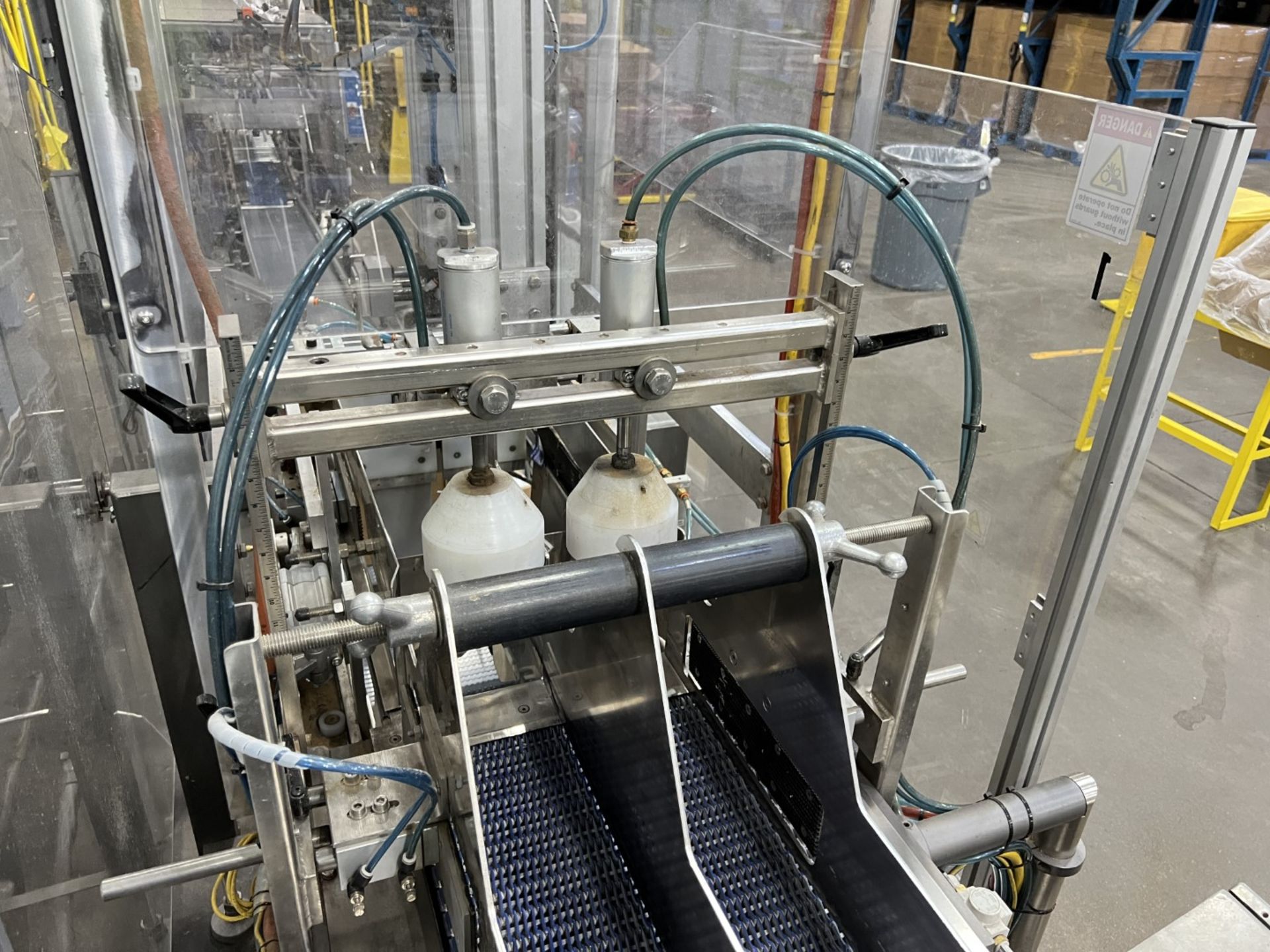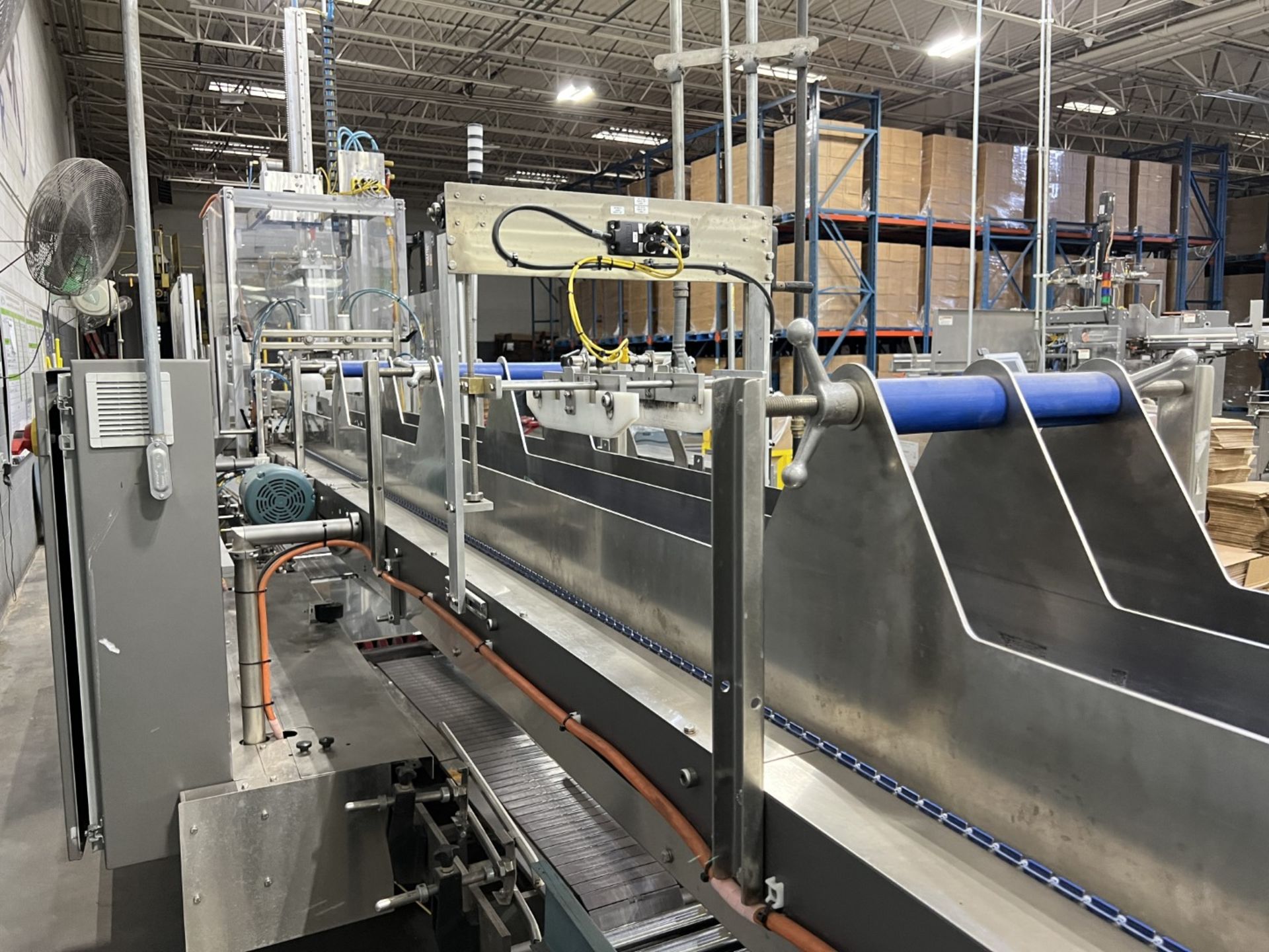 Servo controlled lane divider, Lug case infeed and rack and pinion case lift, left to right process, 2 stainless lane guide to packing heads on, 24″ long case drop station, Control panel with AB Compact Logix 5380 ethernet, 5069-L-31ERM PLC, Kinetix 5500 servo drives, Powerflex 525 VFD Drives, N-tron switches, electrical /automation wiring components, RH side mount touch color HMI, bottle count emitter /receiver, back up sensors, (35 cpm production speed doing single 4 pack gallons)
