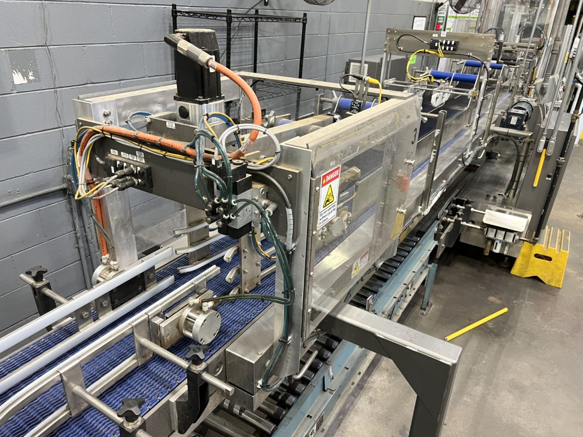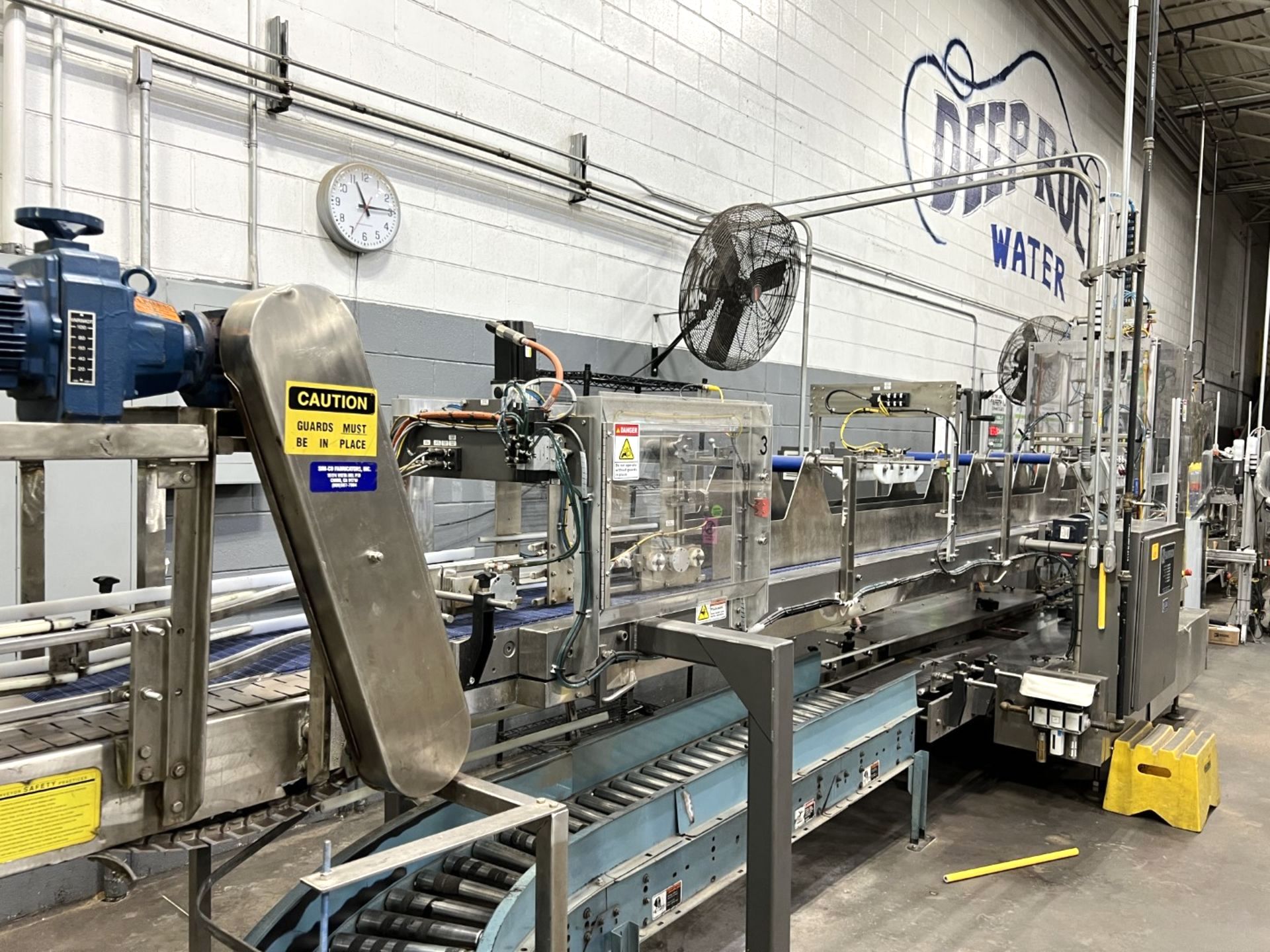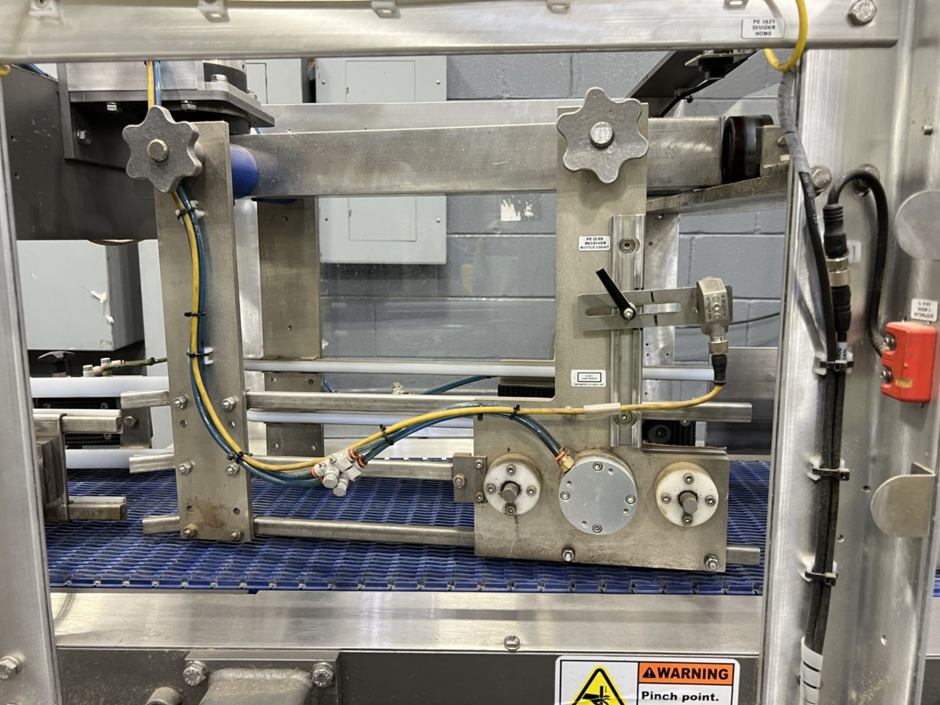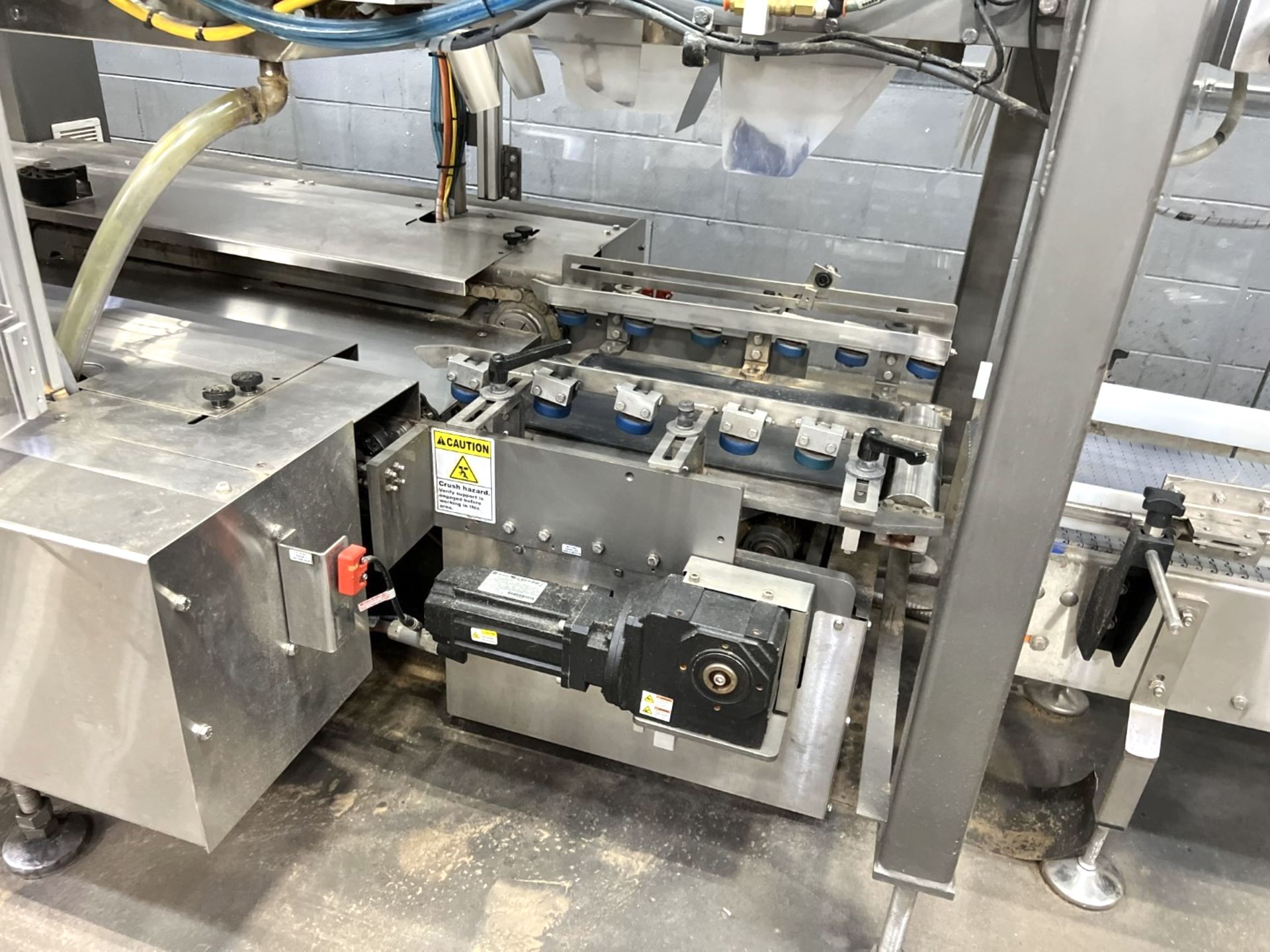 Servo controlled lane divider, Lug case infeed and rack and pinion case lift, left to right process, 2 stainless lane guide to packing heads on, 24″ long case drop station, Control panel with AB Compact Logix 5380 ethernet, 5069-L-31ERM PLC, Kinetix 5500 servo drives, Powerflex 525 VFD Drives, N-tron switches, electrical /automation wiring components, RH side mount touch color HMI, bottle count emitter /receiver, back up sensors, (35 cpm production speed doing single 4 pack gallons)