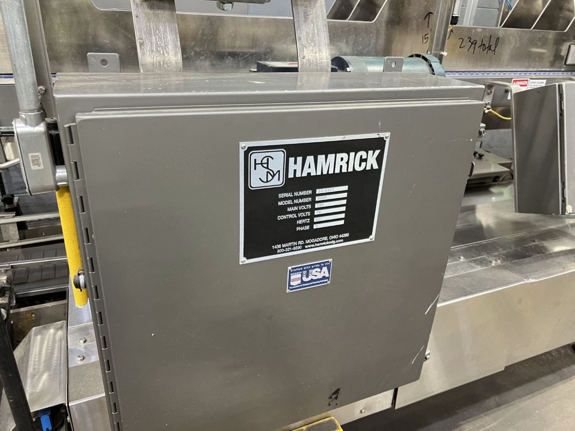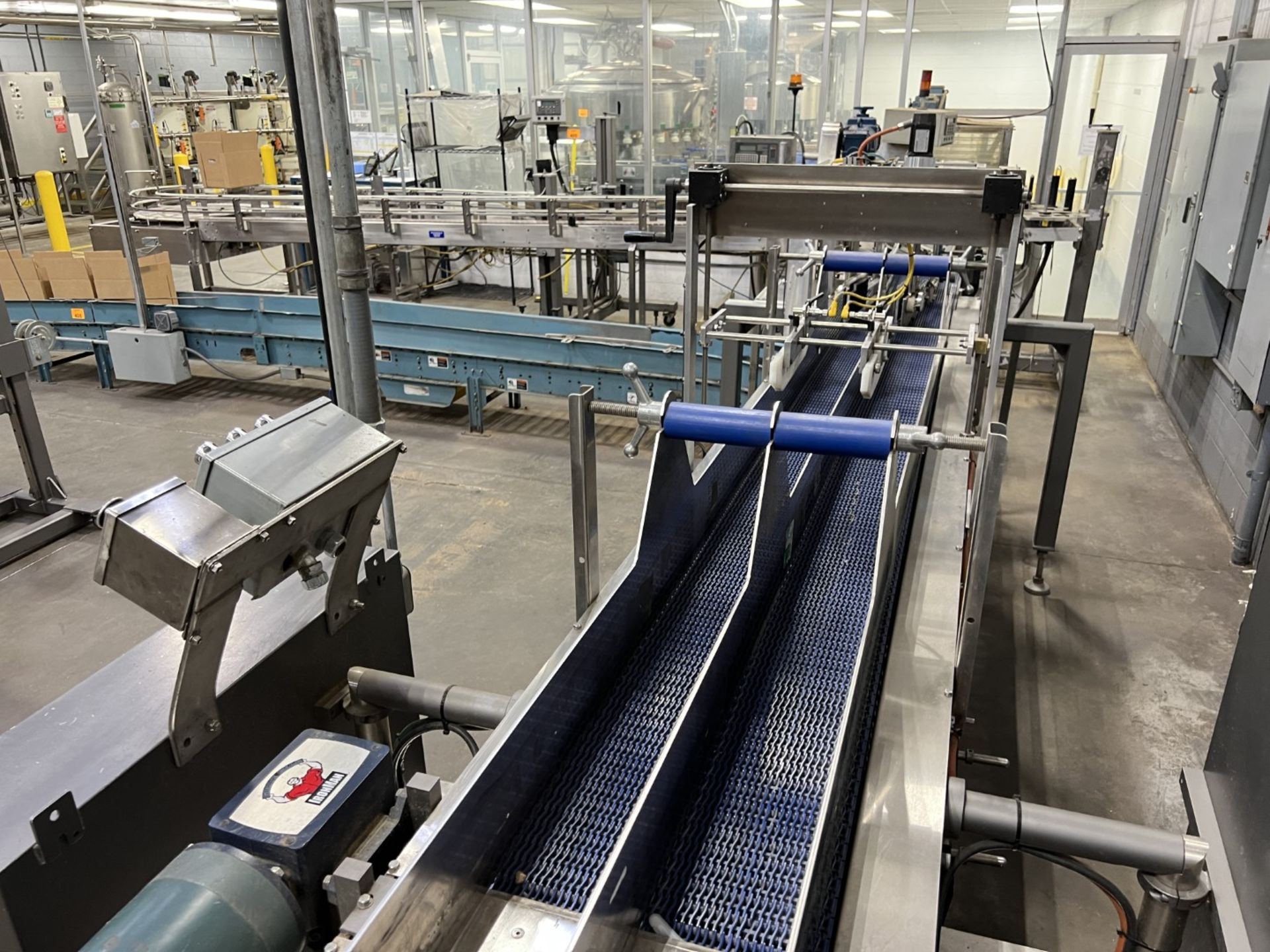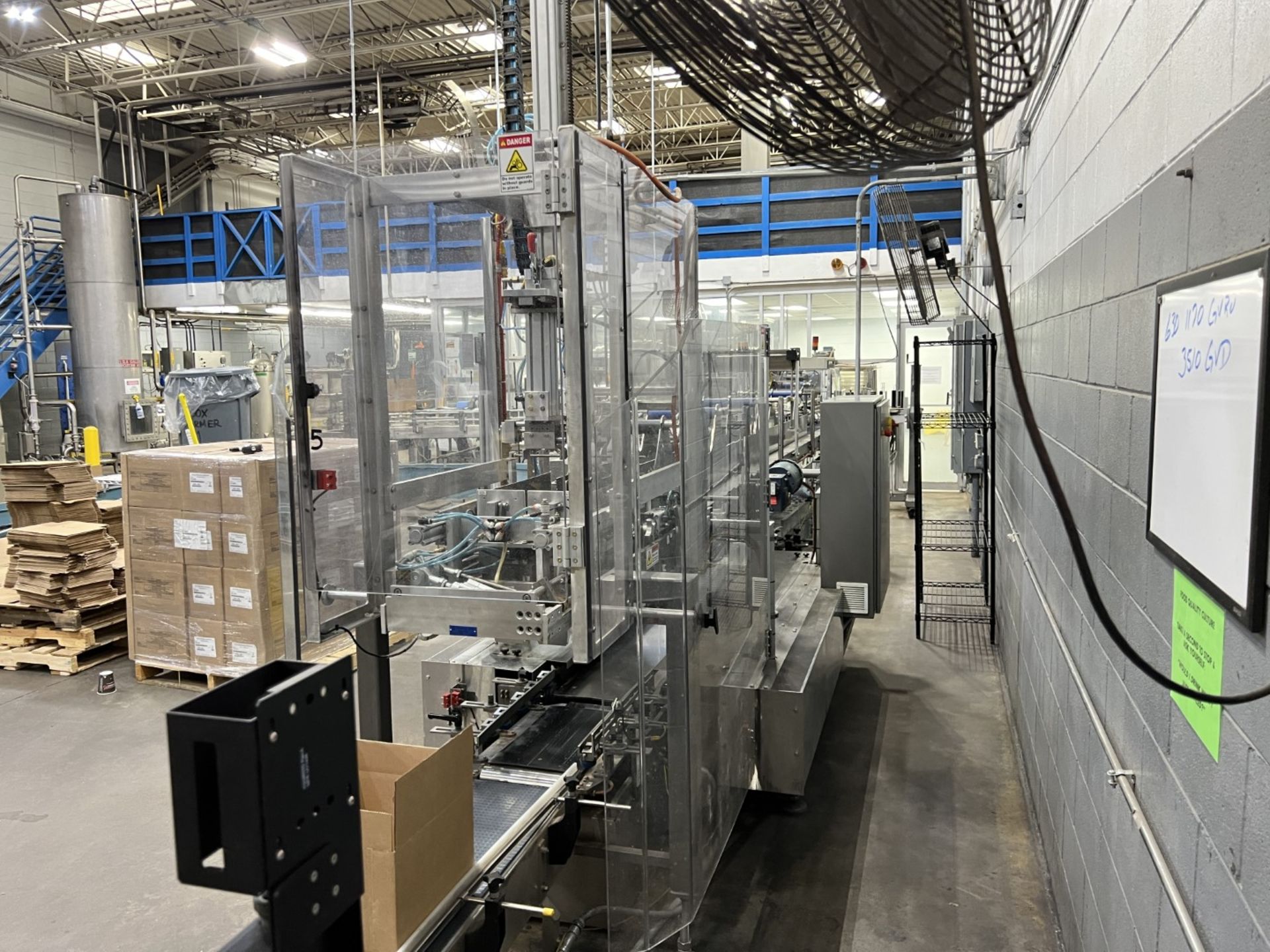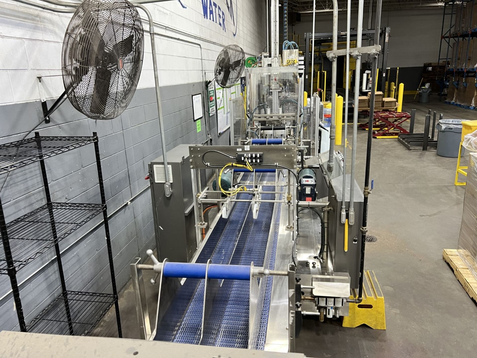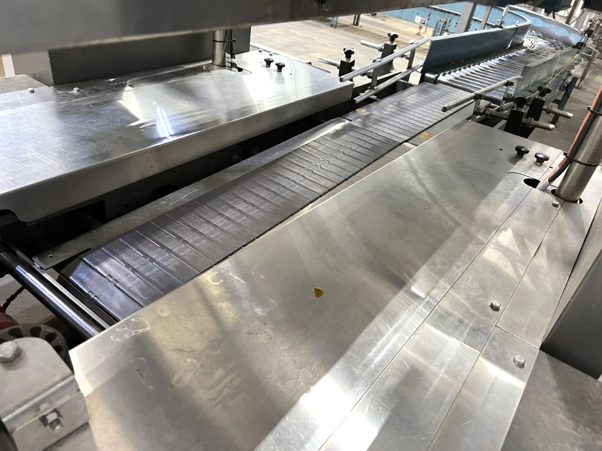 Servo controlled lane divider, Lug case infeed and rack and pinion case lift, left to right process, 2 stainless lane guide to packing heads on, 24″ long case drop station, Control panel with AB Compact Logix 5380 ethernet, 5069-L-31ERM PLC, Kinetix 5500 servo drives, Powerflex 525 VFD Drives, N-tron switches, electrical /automation wiring components, RH side mount touch color HMI, bottle count emitter /receiver, back up sensors, (35 cpm production speed doing single 4 pack gallons)