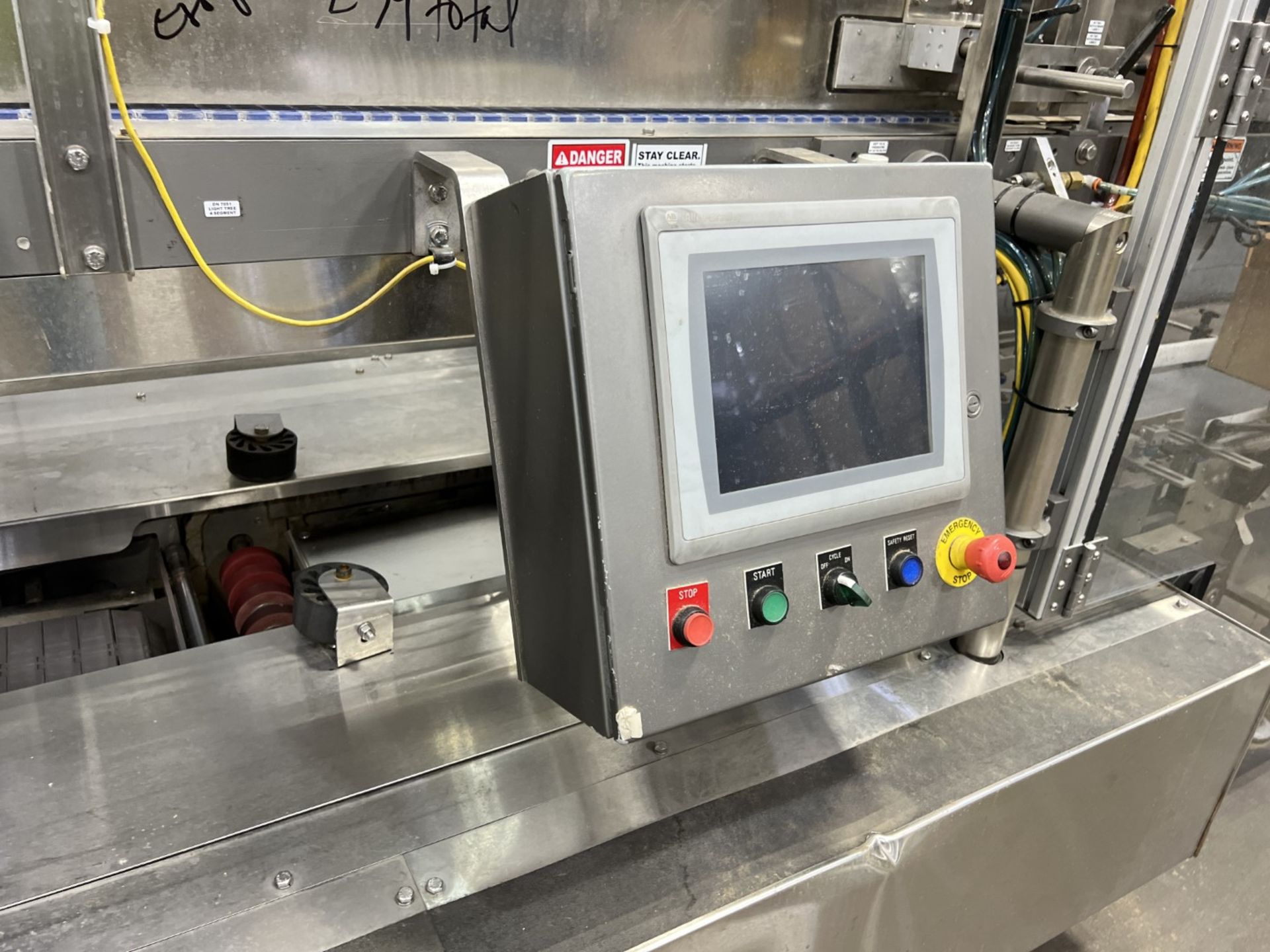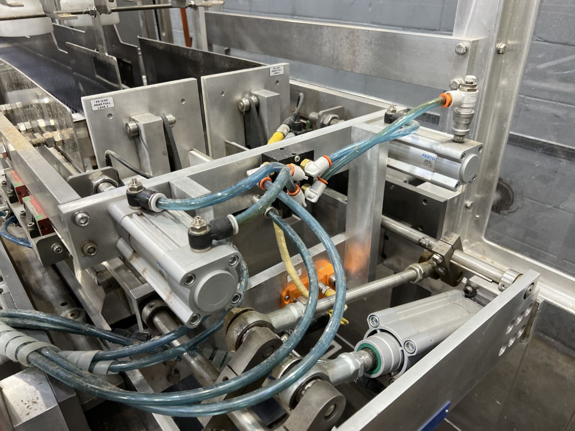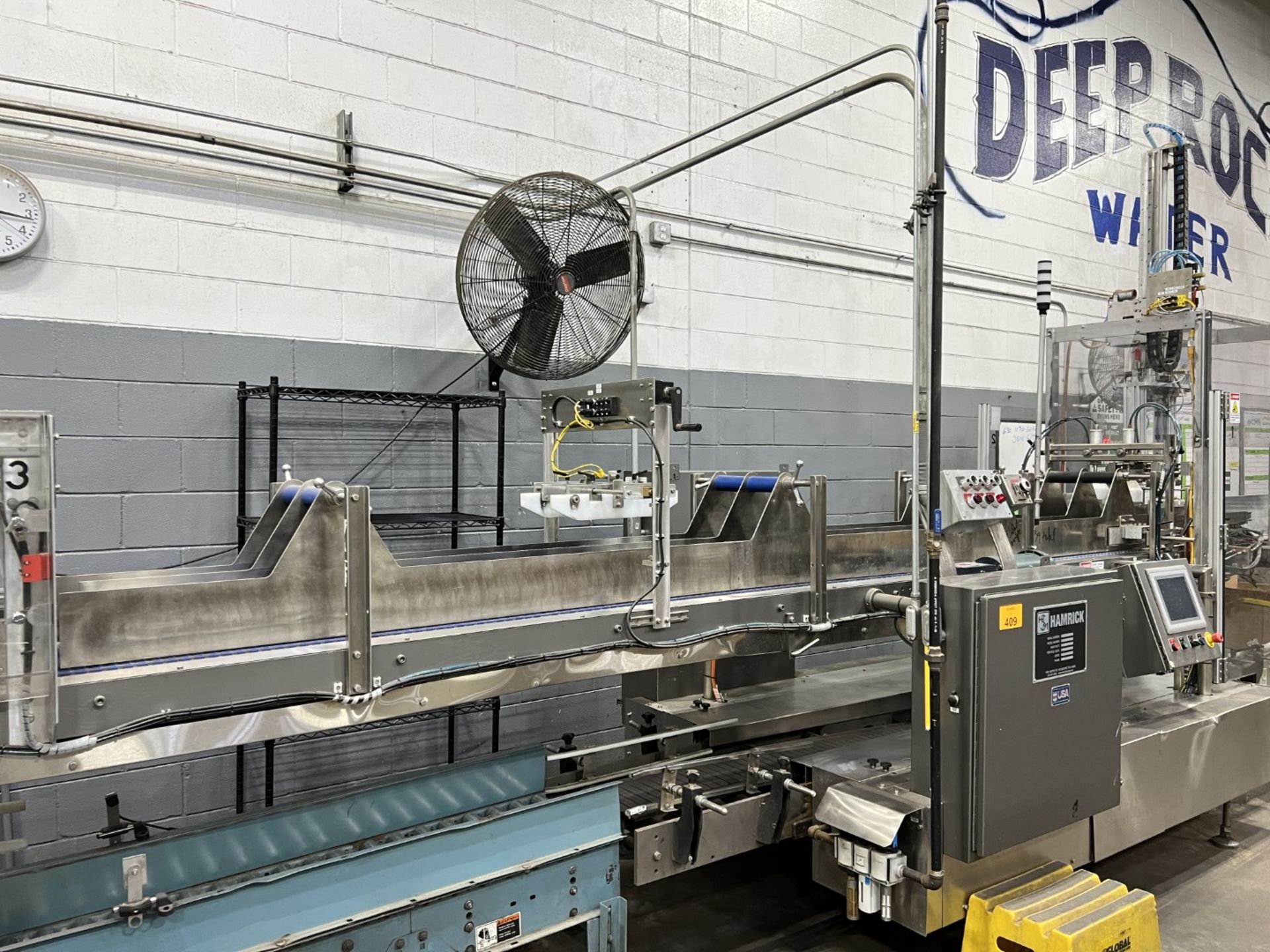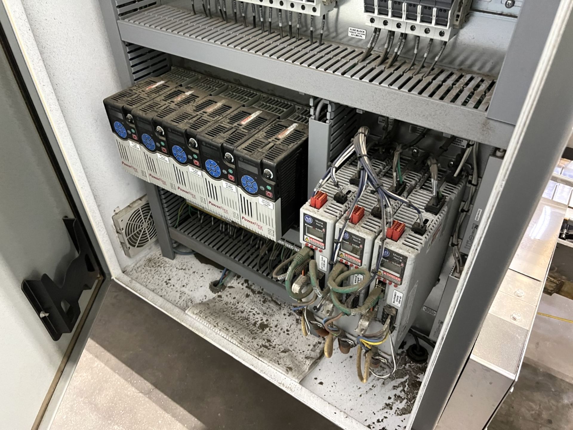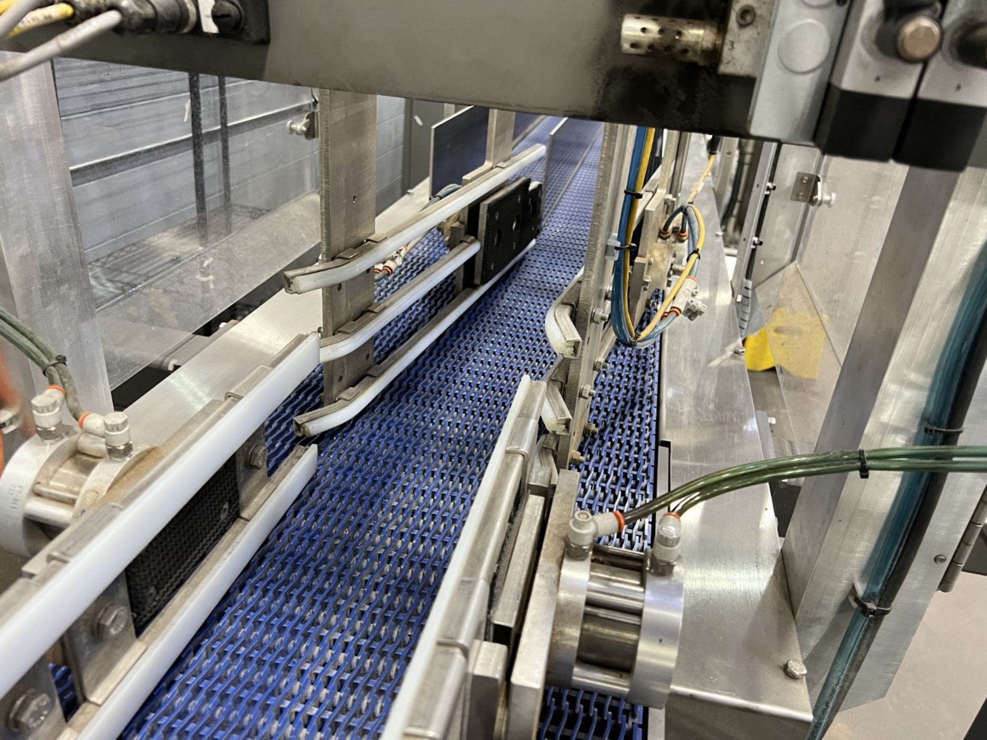 Servo controlled lane divider, Lug case infeed and rack and pinion case lift, left to right process, 2 stainless lane guide to packing heads on, 24″ long case drop station, Control panel with AB Compact Logix 5380 ethernet, 5069-L-31ERM PLC, Kinetix 5500 servo drives, Powerflex 525 VFD Drives, N-tron switches, electrical /automation wiring components, RH side mount touch color HMI, bottle count emitter /receiver, back up sensors, (35 cpm production speed doing single 4 pack gallons)
