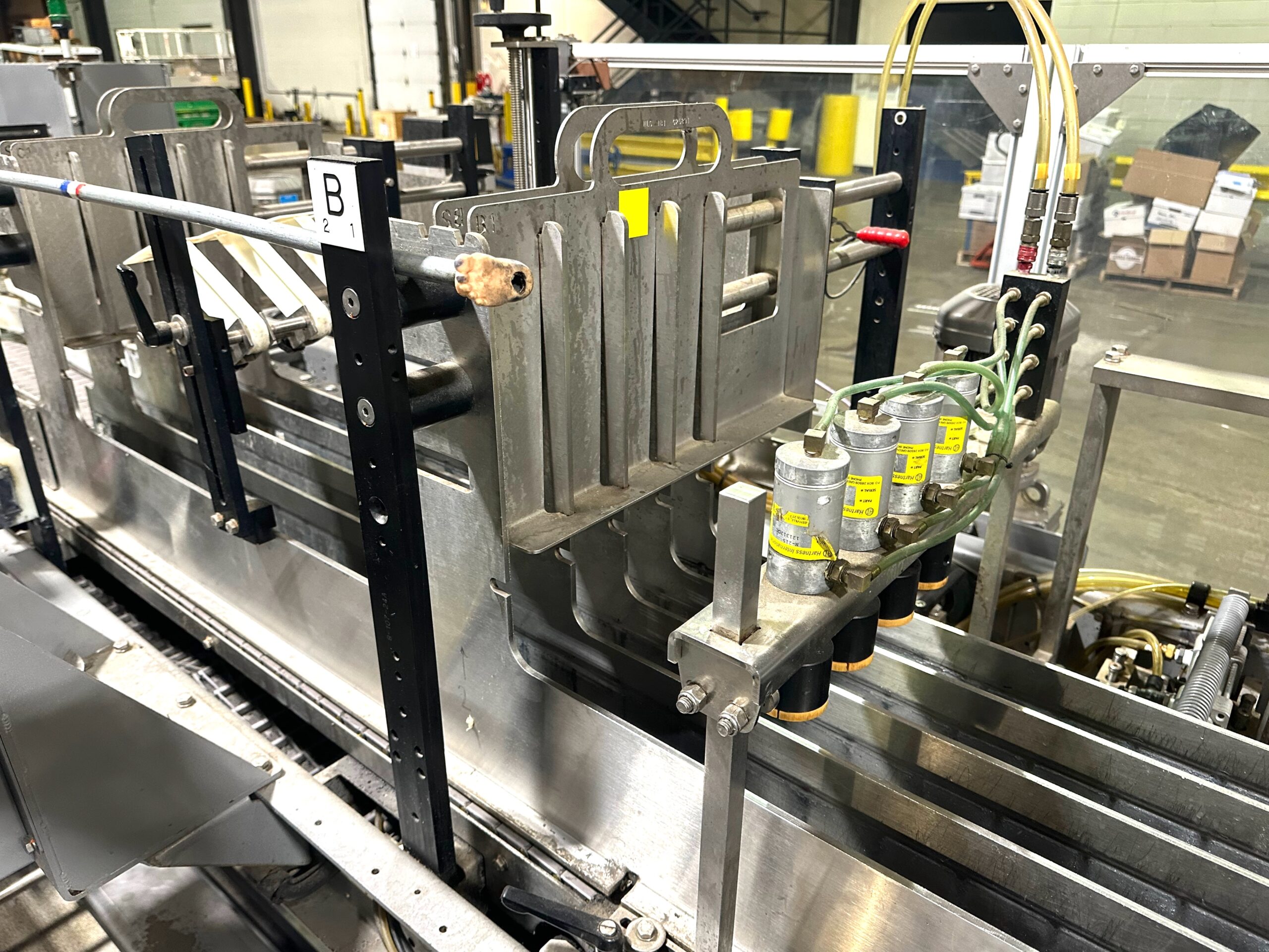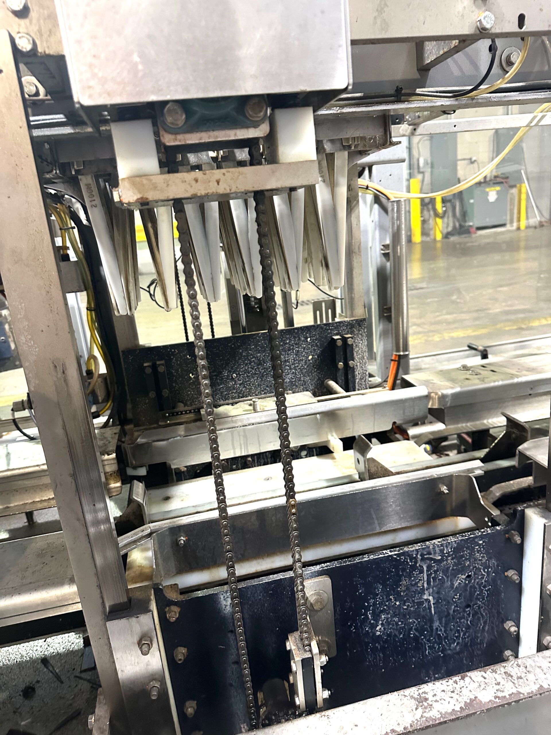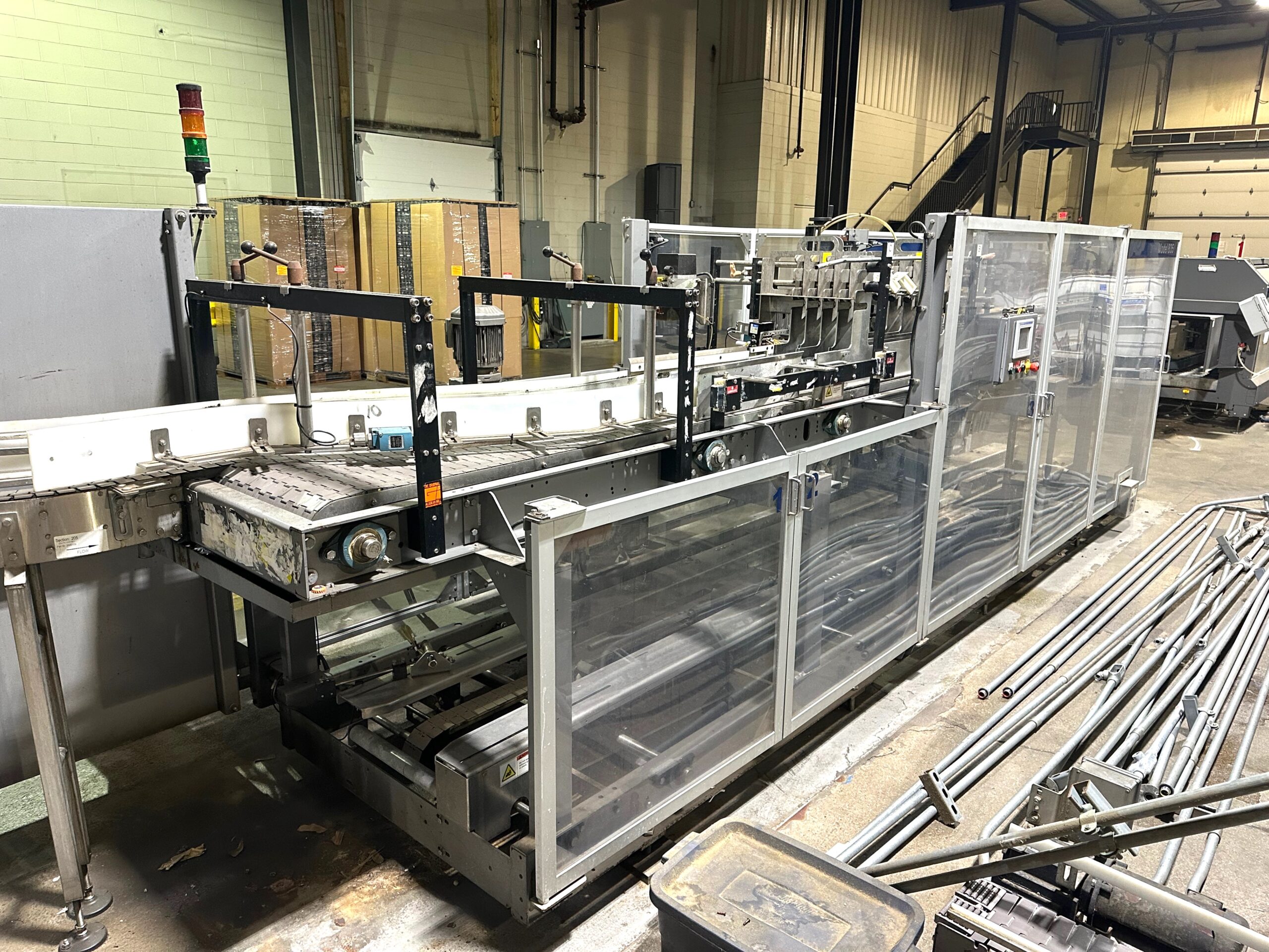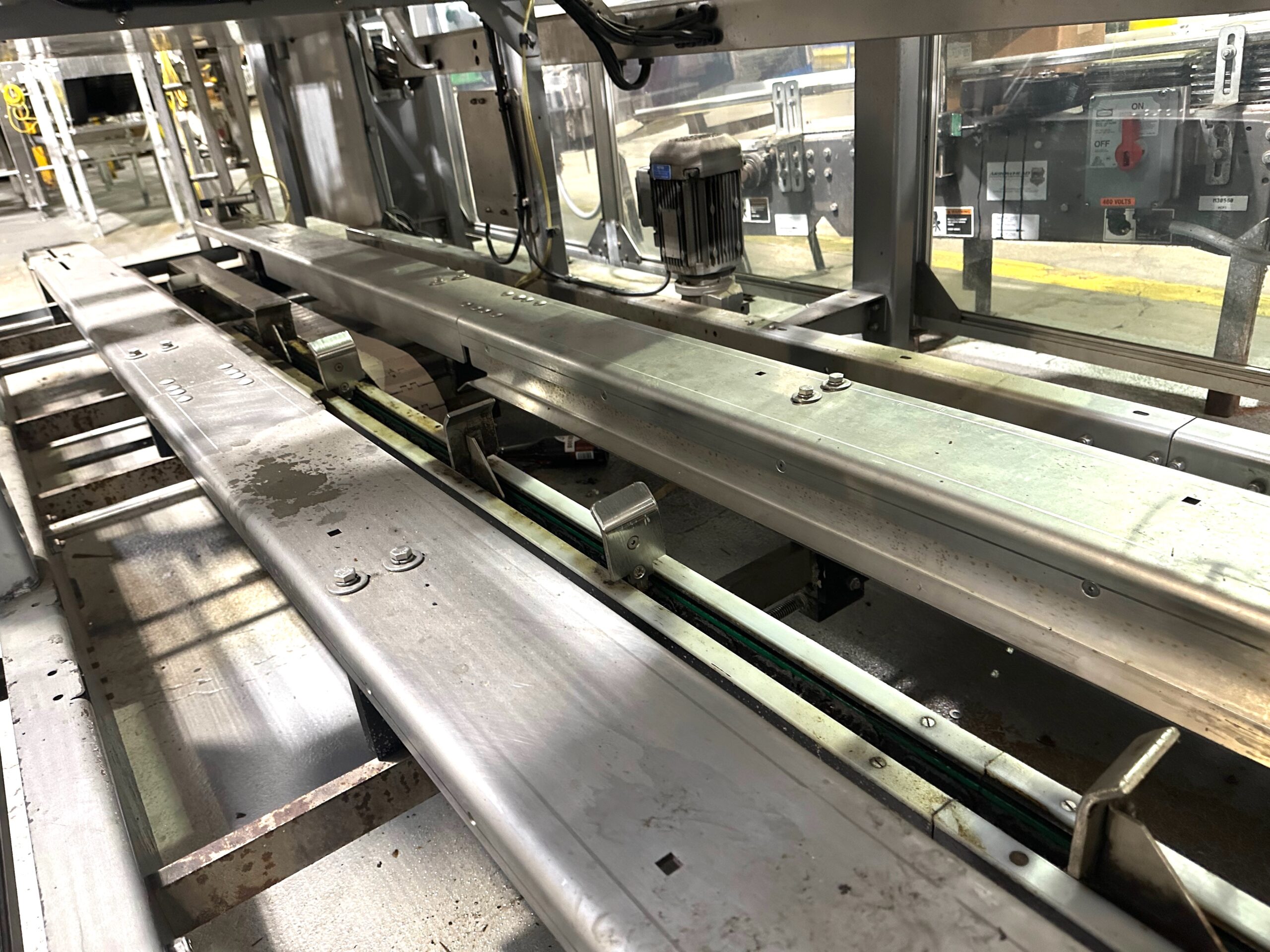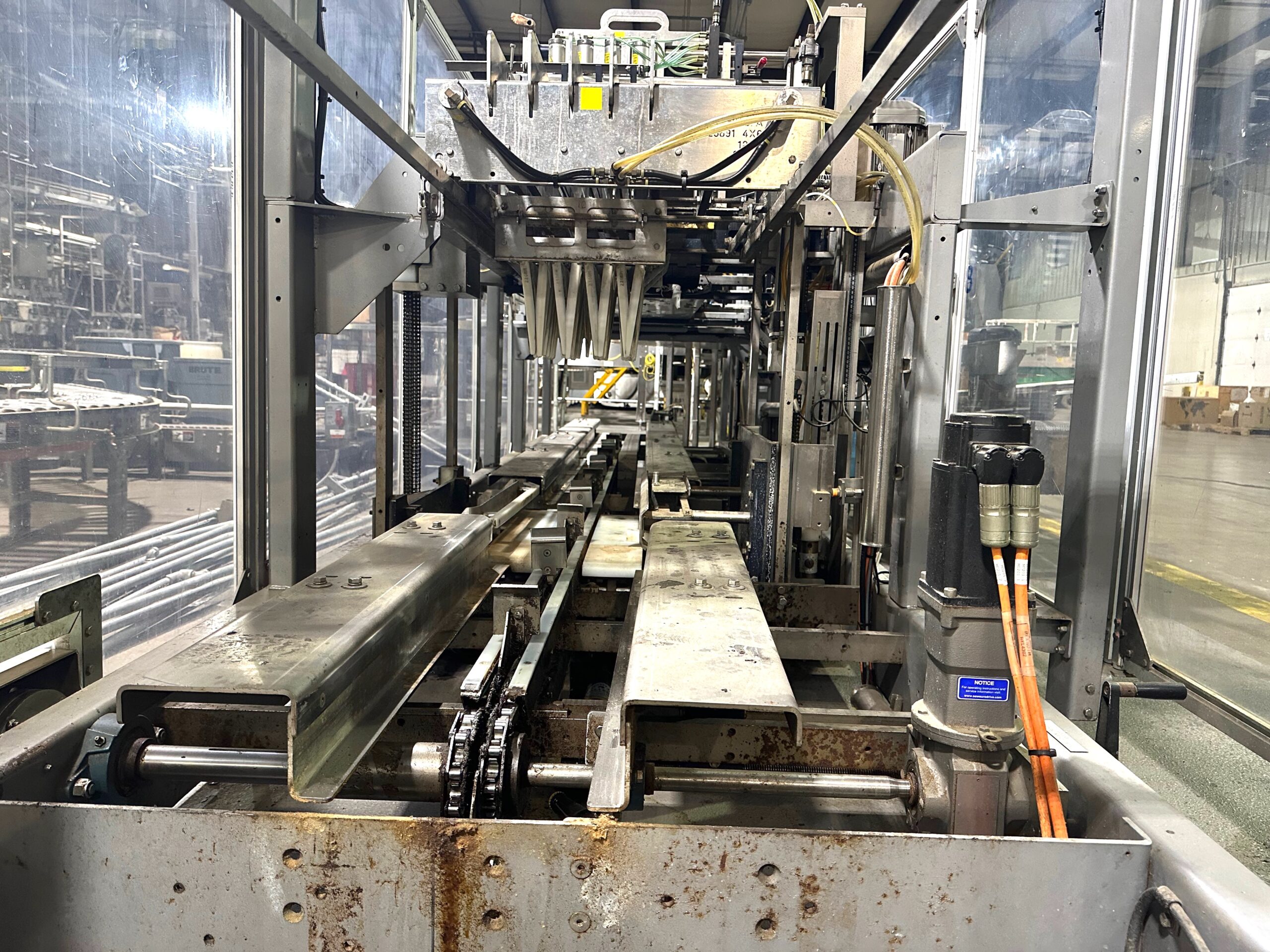 Mild Steel Construction, Standard Feed, Left to Right Hand Machine (from operator touchscreen), Lowering Head Machine, High Speed Machine up to 30 cases/minute, Last running 12oz. Glass Bottles in 24 Pack Pattern, Automatic Central Lube, Voltage: 460V 3ph 60hz