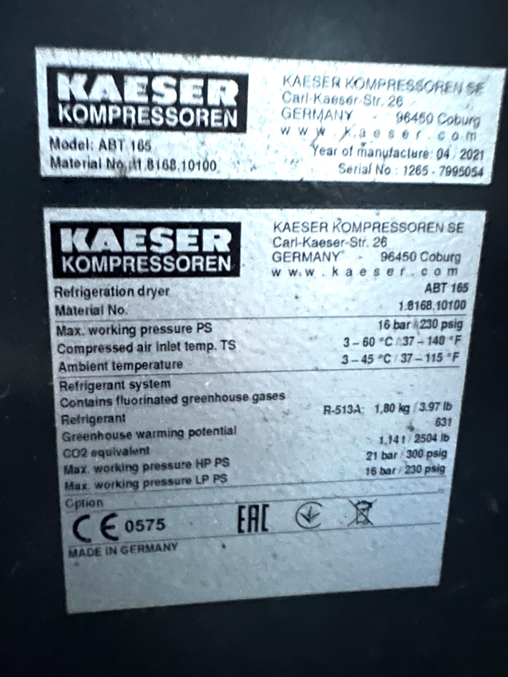 Last used in Beverage Plant Application, Built in Air Dryer, Air Filters and Main Disconnect Electrical Panel, Running up to December 2025, Estimated 37,000 Hours