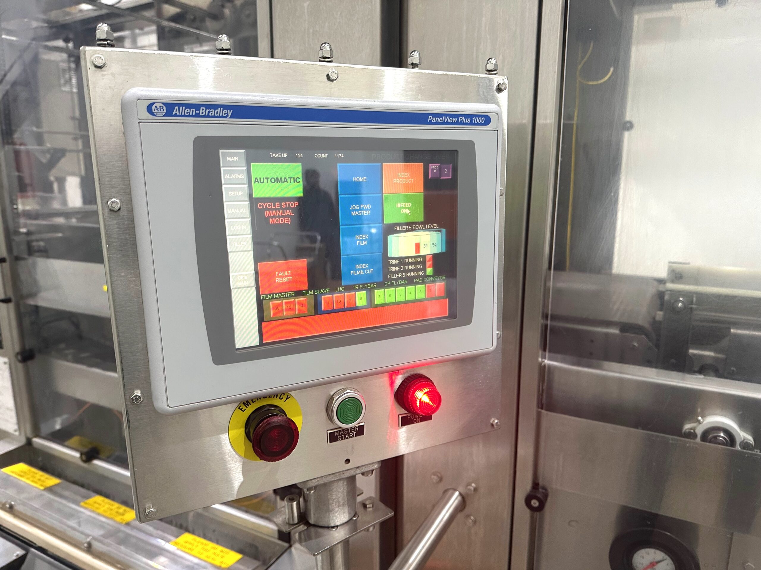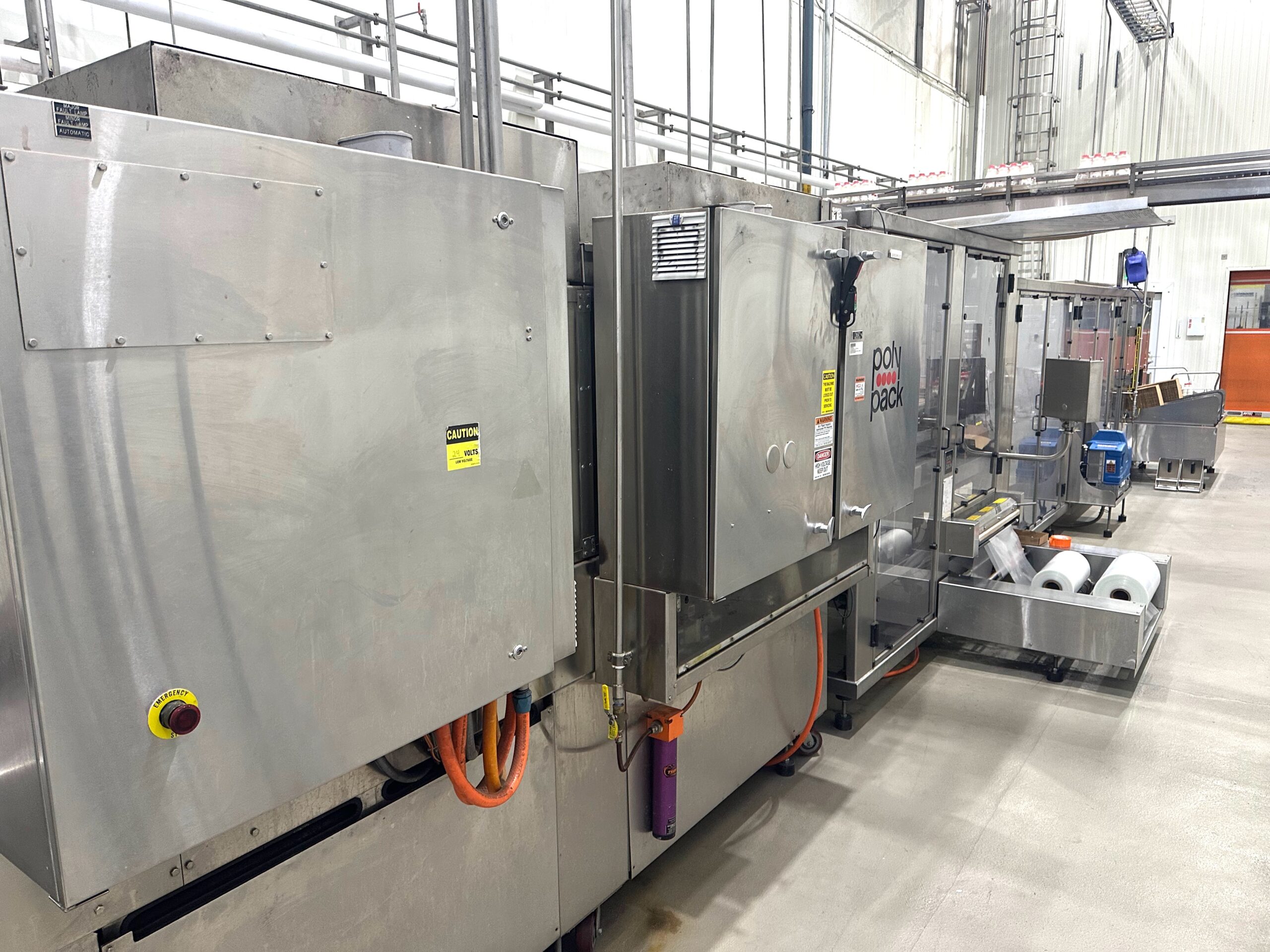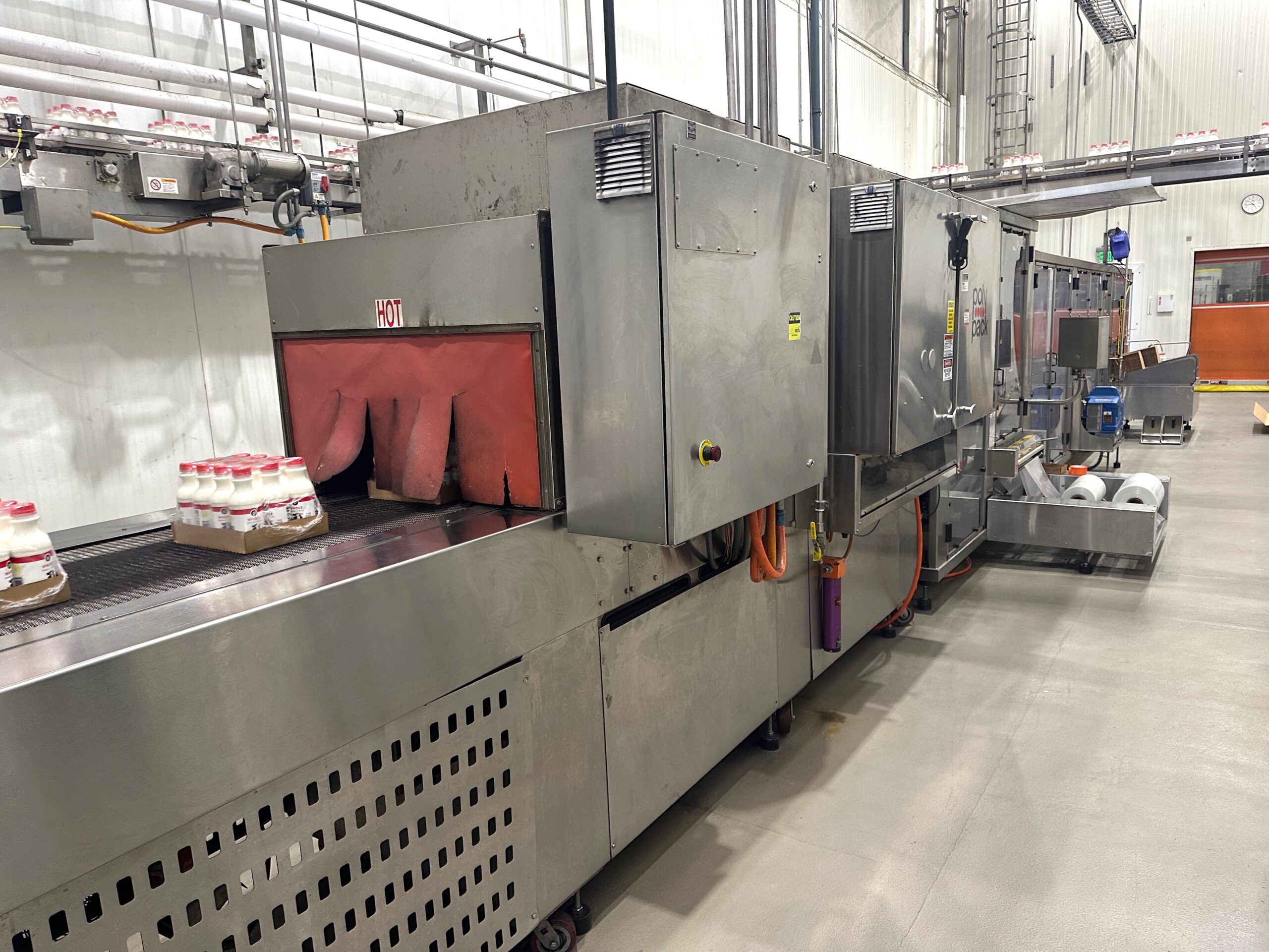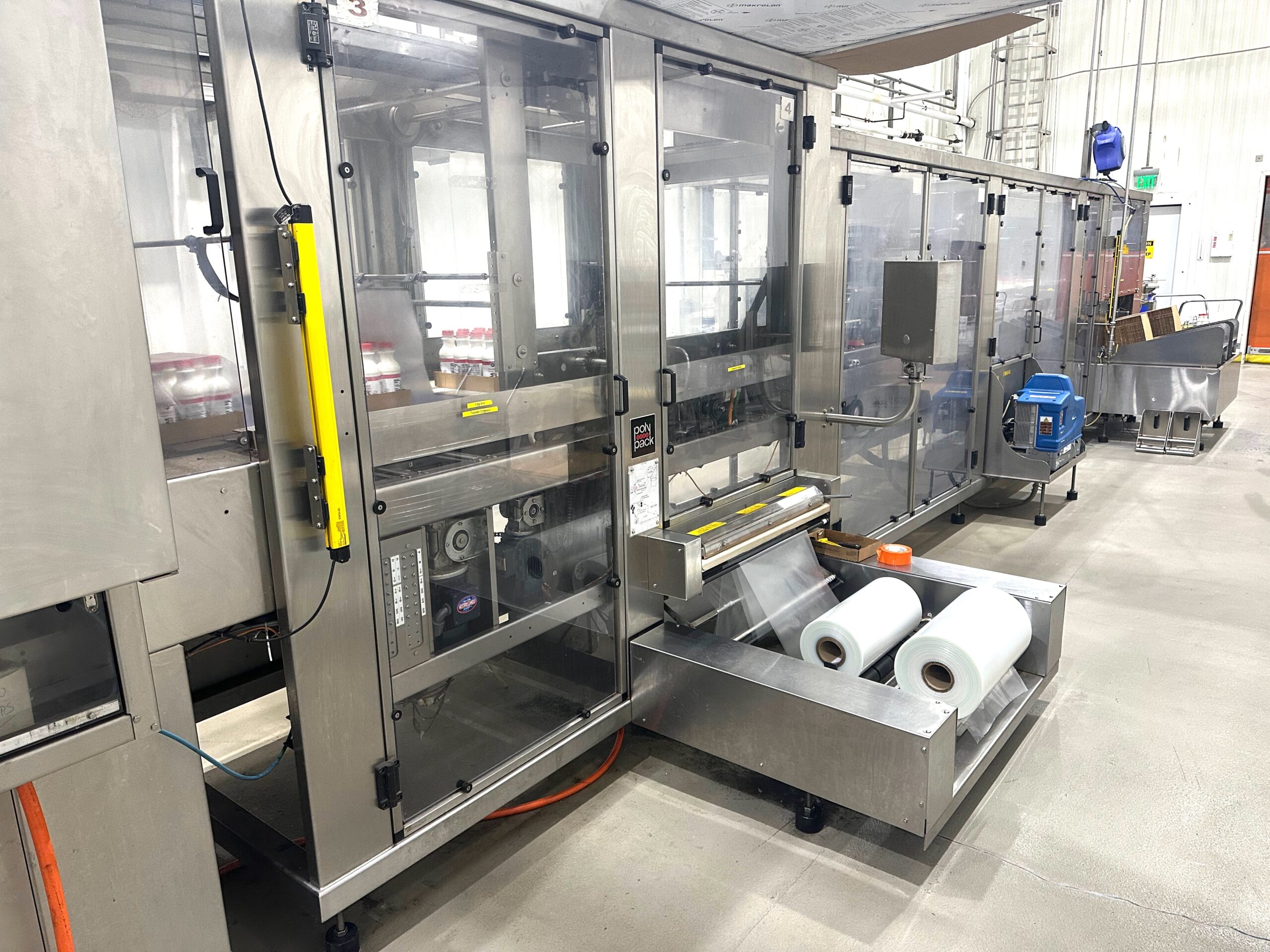 STAINLESS STEEL CONSTRUCTION, Installed in 2015, In Operation till October 2025, Continuous motion tray packer and Shrinkwrapper for PET, Glass Bottles or Canned Product, Will run trays + shrink film, Max Speeds up to 50 Cycles/Minute, See Package Patterns Below, Will function with end slotted trays with 90 Degree corners, Single Roll Shrink Wrapper to run clear or print film registration, Servo Controlled Film Feed Cutting and Wand Wrapping, Infeed/Discharge height of 49 inches, Lexan Guarded Doors with Safety Switches, Control Panel with Allen Bradley Compact Logix PLC with Panelview 1000 Plus Operator touchscreen, Allen Bradley Kinetix Servo Drives, Nordson ProBlue Glue System, 480 Volts, 3 Phase, 60 HZ, Manuals-Documentation Included